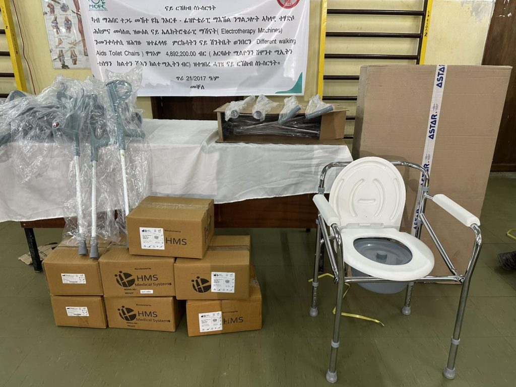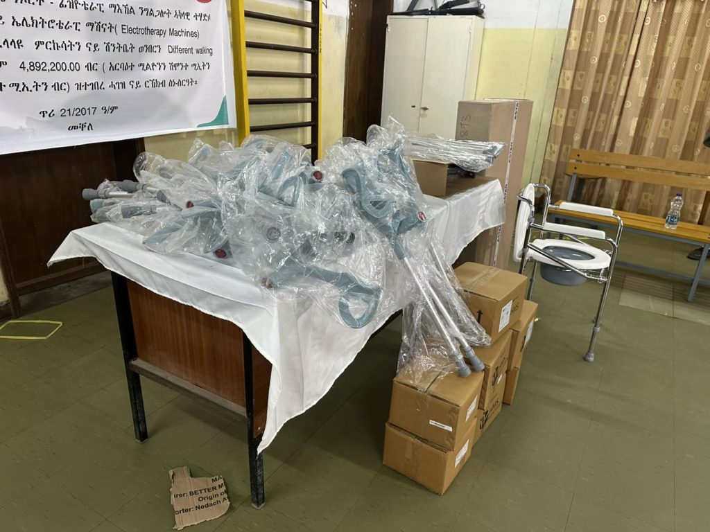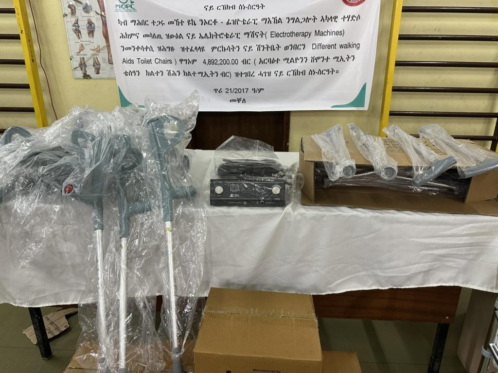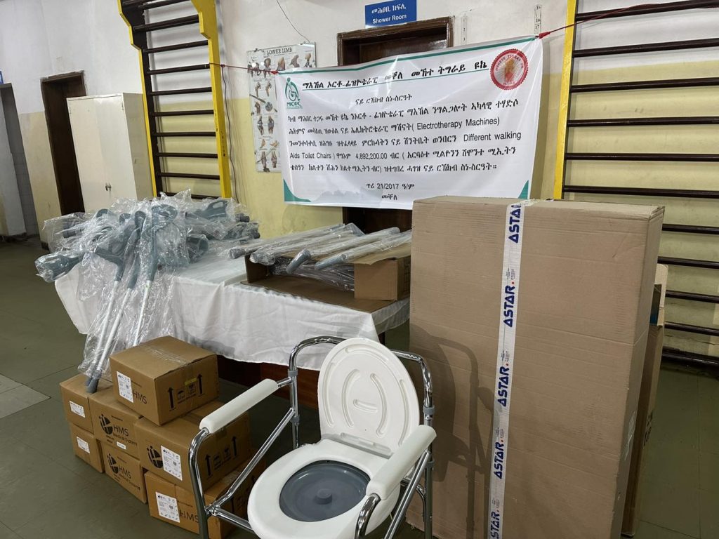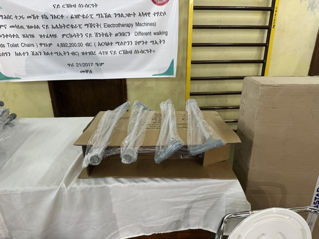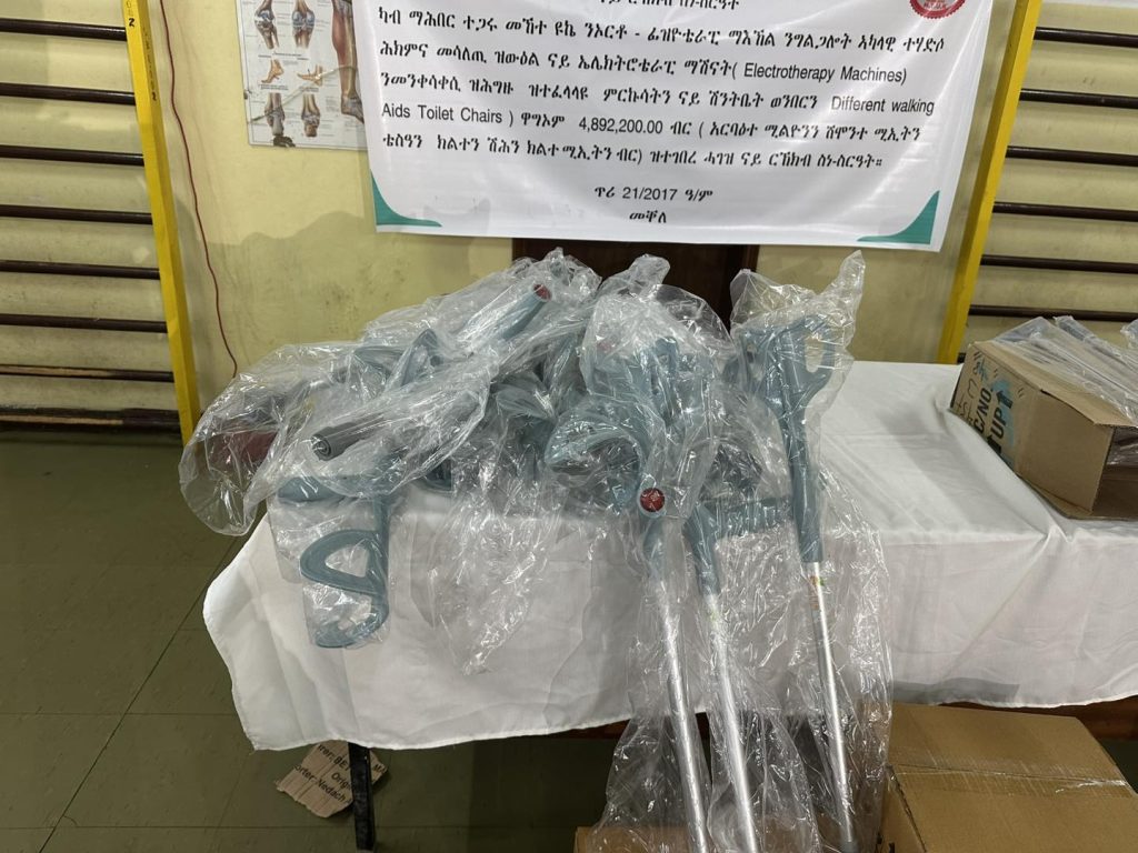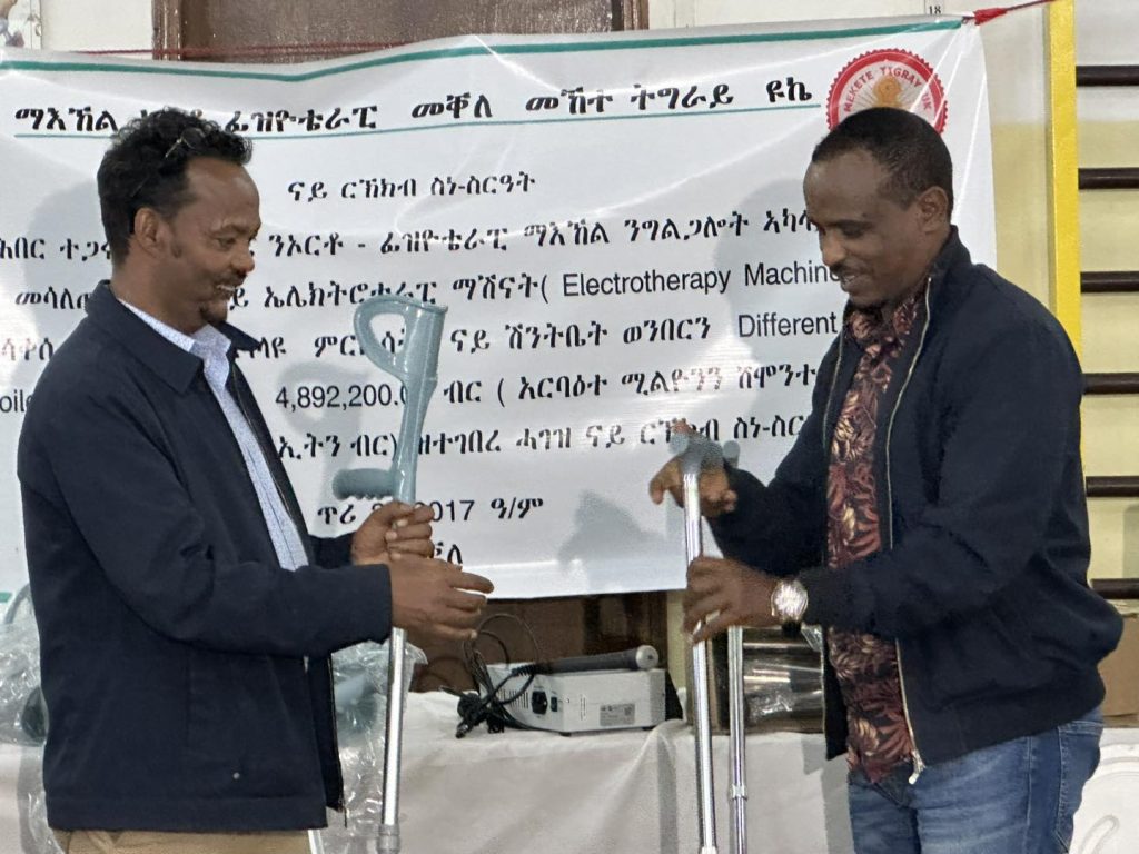 ካብ መኸተ ትግራይ ዩኬ ንመቐለ ኦርቶ ፊዝዮተራፒ ማእኸል ንግልጋሎት ኣካላዊ ተሃድሶ ሕክምና መሳለጢ ዝውዕል ናይ ኤሌክትሮቴራፒ ማሽናት፣ ንመንቀሳቐሲ ዝሕግዙ ዝተፈላለዩ ምርኩሳትን ናይ ሽንት ቤት ወንበር ብብር ልዕሊ 4.9 ሚልየን ብር ዝተገዝኡ ናይ ሕክምና ናውቲ ርክክብ ተኻይዱ።