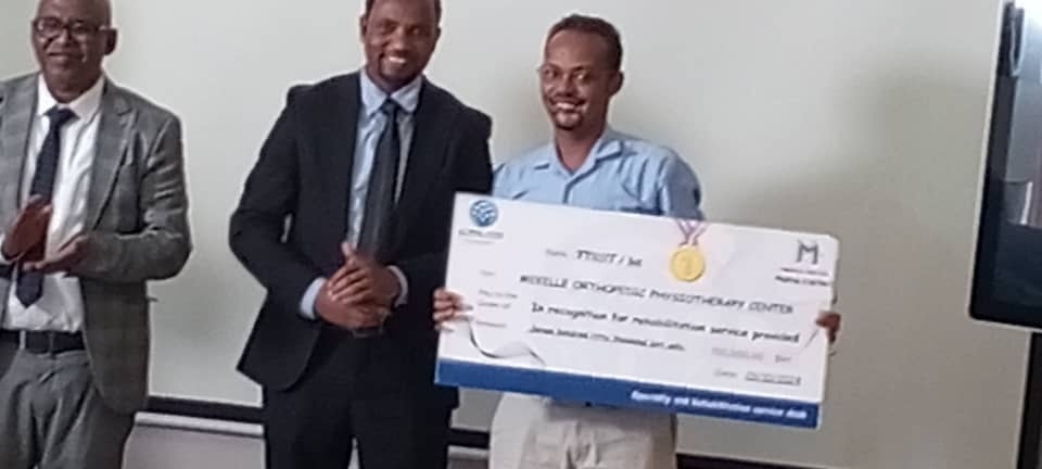 ኣብ ከተማ ሃዋሳ ብኣሳናዳኣይነት ሚኒስትሪ ጥዕና ኢትዮጲያ ኣብ ዝተኻየደ ዋዕላ ኣብ ማሕበር ጉዱኣት ኲናት ትግራይ ማእኸል ኦርቶ-ፊዝዮቴራፒ መቐለ ብመዐቀኒ ውድብ ጥዕና ዓለም ኣብ መላእ ኢትዮጲያ ካብ ዝርከባ 15 ማእኸላት Ortho-Physiotherapy ብሉፅ ኾይኑ ስለ ዝተረኸበ ቐዳማይ ብርኪ ብምርካብ ተሸላማይ ምስክር ወረቐትን 1,200,00 (ሓደ ሚልየንን ክልተ ሚእቲ ሽሕ) ብርን ኮይኑ ኣሎ።